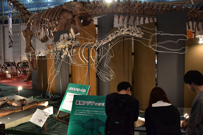 2017(平成29)年7月15日(土)〜9月3日(日)にかけて幕張メッセの国際展示場にて開催されたギガ恐竜展2017−地球の絶対王者のなぞ−。全長約38メートルの超巨大竜脚類「ルヤンゴサウルス」や、卵から孵る前の状態の実物化石「ベイビー・ルイ」、共食いティラノサウルスの3点を目玉として、数多くの標本が集められました。これらの大きな化石に目が奪われますが、今回の博覧会で注目していただきたいのは、外見や食べ物といった恐竜の復元を変えた化石たちの紹介、それに恐竜の動きに関する研究や卵化石、古生物の世界的分布といった研究成果。目立つ標本ではありませんが、これらの解説は詳細な説明がされており、現在の研究者たちの考えをしることができます。この展覧会の本当の目玉は、まさにこれらの研究成果というところでしょう。ここに注目です。