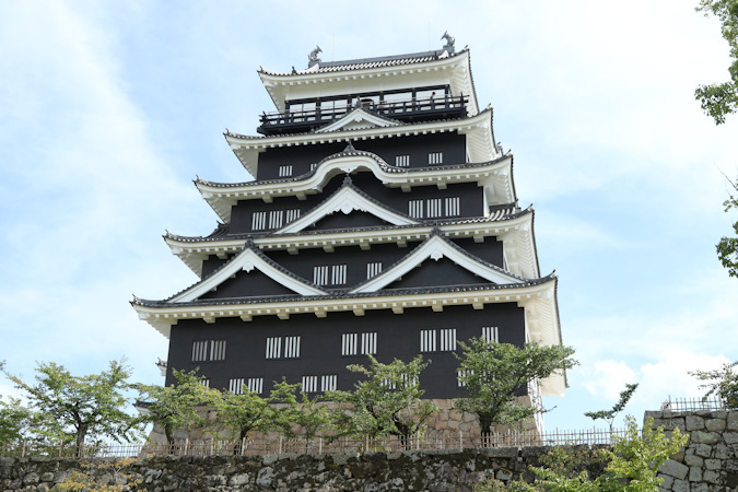 明治維新後も城はよく残りましたが、1945(昭和20)年8月8日の空襲で天守閣が焼失してしまった。しかし、市民の熱意により1966(昭和41)年秋、市制50周年記念事業として天守閣のほか、月見櫓、御湯殿、鏡櫓が再建されました。また、在来線と山陽新幹線が三の丸に通されたため、駅から城が非常によく見えるのが特徴です。