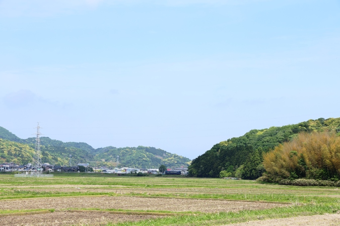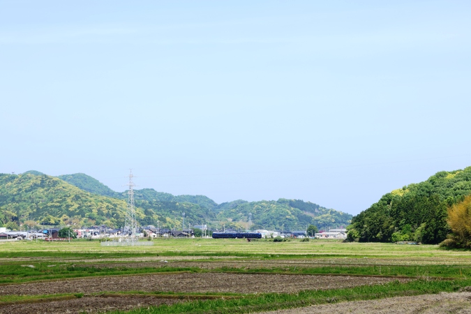列車は朝にアオサギ達が集ってた田圃の辺りを通過してます