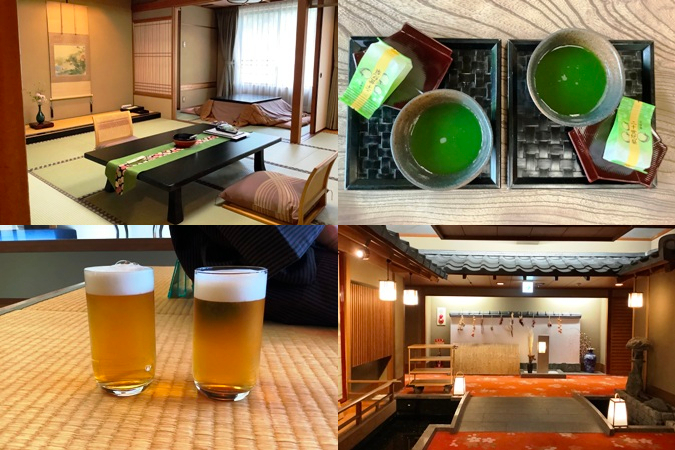 お部屋と地下2階大浴場のお休み処でのグリーンティに 展望桧風呂の湯上がり処でもビールを頂きます♪