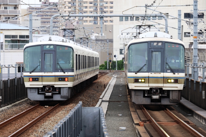 (左)クハ221-1 近ナラ 2443S (右)クハ221-36 近ナラ 2438S/おおさか東線高井田中央駅