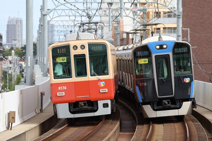 (左)クハ8536 尼崎 列番不明 急行 (右)クモハ5710 尼崎 列番不明 /阪神電鉄本線鳴尾・武庫川女子大前駅
