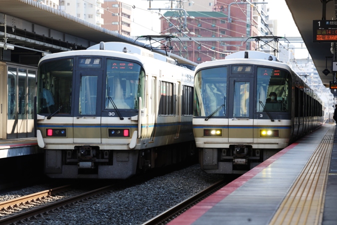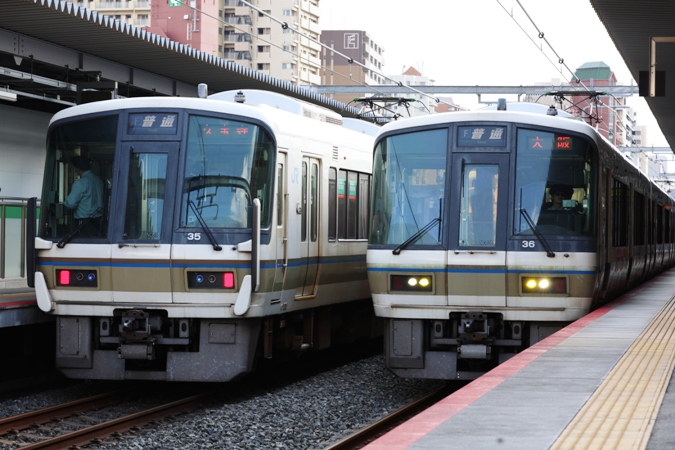 (左)クモハ221-35 近ナラ 2458S (右)クモハ221-36 近ナラ 2461S/おおさか東線JR野江駅