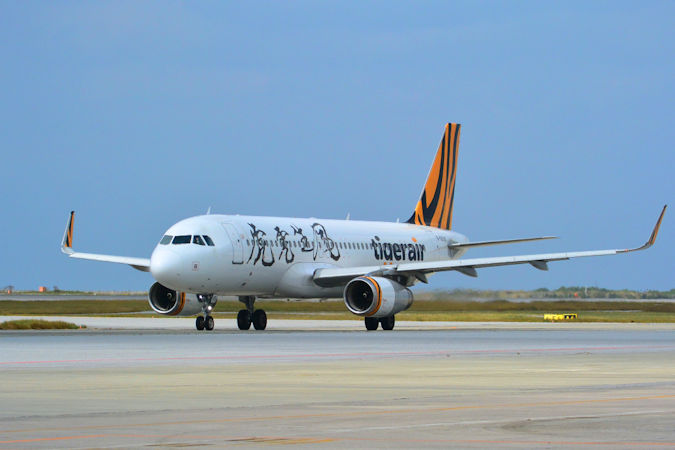 タイガーエア台湾の「寅」年記念「虎虎生風」塗装機。エアバスA320(機体番号:B-50015)。描かれている「虎虎生風」とは「虎のように勇猛果敢」の意味で、台湾の芸術家である董陽孜(Ms.Tong Yang-tze)氏の手によるもの。