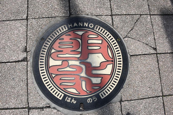 調査者:裏辺金好コメント:2022(令和4)年に登場したデザインで、公共下水道事業の認可70周年を記念したもの。マンホール蓋の丸い形を印鑑に見立てて、飯能の文字を鮮やかにカラーリング。色は5種類あり、飯能駅南口(赤文字版)、東飯能駅東口(青文字版)、中央公園東側入口(黄文字版)、あさひ山展望公園東側入口(桃文字版)、阿岩橋北側交差点(緑文字版)となっている。