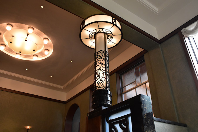 2階広間の照明。階段に設置された照明柱は詳細な資料が残っていないそうですが、ユニークな形状です。また、天井の照明は宮内省内匠寮が設計したもので、8つのランプが円形に並んでいます。