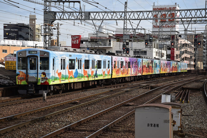近鉄1026系「ならしかトレイン」。イラストレーター「げみ」氏が近鉄奈良駅周辺の風景と鹿などをデザインしたものです。また、車内も「げみ」氏のイラストのほか、かわいらしい鹿の形のつり革や鹿の背中をイメージしたシートなどの装飾が施されており、楽しい雰囲気になっています。