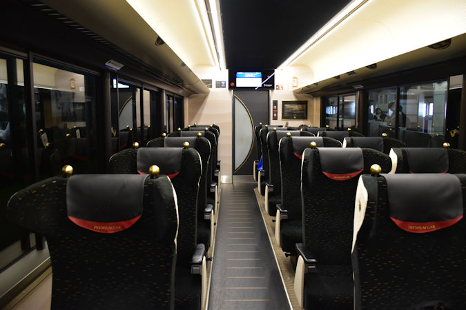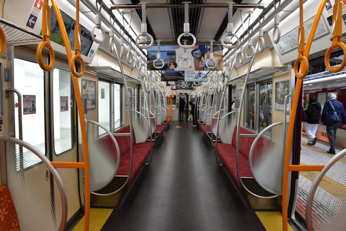 京都駅では、近鉄1233系(1237編成)のリニューアル編成を撮影。近鉄で2023年夏から進められている大規模リニューアル工事で内外装が一新され、シートモケットの色・柄や袖仕切り形状が大きく変更されたほか、大型ディスプレイによる車内案内表示器を扉上に千鳥状に配置し、さらに室内照明はLEDからの間接照明になっています。