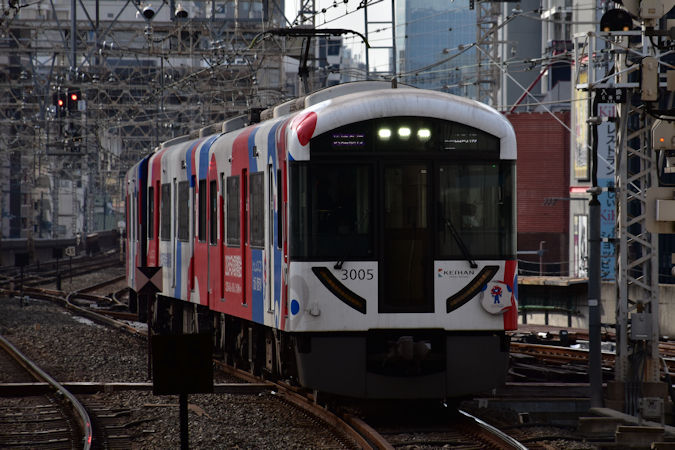 さて、いい加減に京都へ向かいます。京橋駅から万博ラッピング列車の3000系に乗り込み、「プレミアムカー」に初乗車。高級感があり、通勤時間帯にこれに課金できる方は優雅な移動になりますね。課金出来ないと、一般車は減車されているので混雑が…ですが。