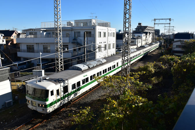 午後は当初の予定通り常磐線沿線で185系C1編成を追いかけます。まずは、金町駅で新金貨物線へ入る前の姿を撮影。この日は、団体臨時列車「洗浄機体験付、操車場巡りの旅」として運転され、上野→大宮→東大宮操車場→大宮操車場→田端操車場→金町→新小岩操車場→金町→上野を走行しています。