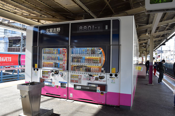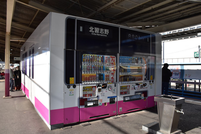 ホームには8800形を模した自動販売機があります。2014(平成26)年に設置されたそうで、ジェントルピンク塗装を導入した、新しい新京成電鉄のイメージPRに一役買っていました。当然のことながら、京成電鉄編入後はお役御免のようです。