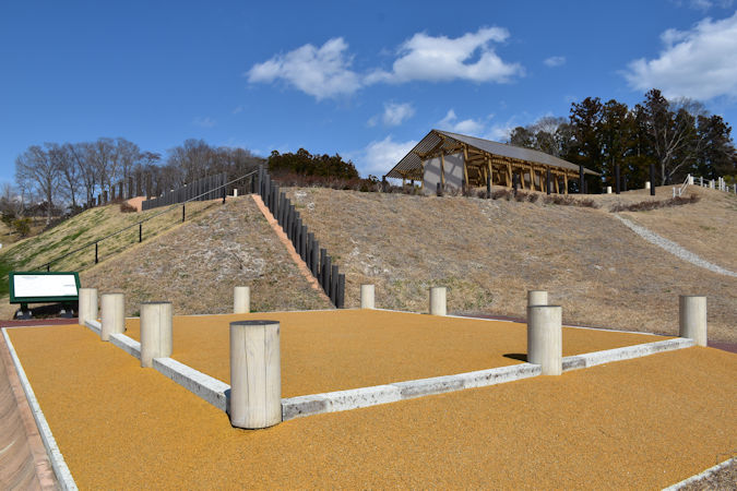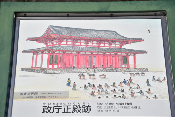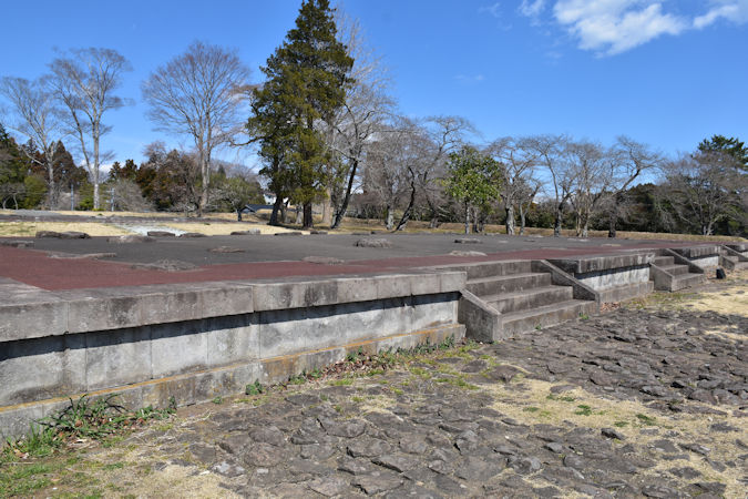 さらに、政庁南大路跡も復元されていました。こちらは外郭南門から政庁まで真っ直ぐ伸びる道路で、第1期〜第2期は13m、第3期〜第4期は23mの幅員があったと考えられます。現在は第2期の頃を想定して復元され、発掘調査を元に石垣も再現されています。