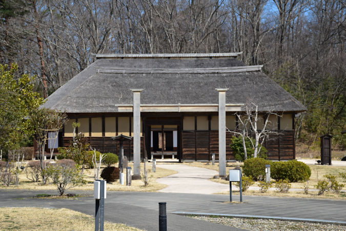 官衙主屋跡。城前官衙主屋の構造を復元したもので、同時期に建てられた法隆寺食堂を参考にしています。屋根は瓦葺であったと考えらえています。