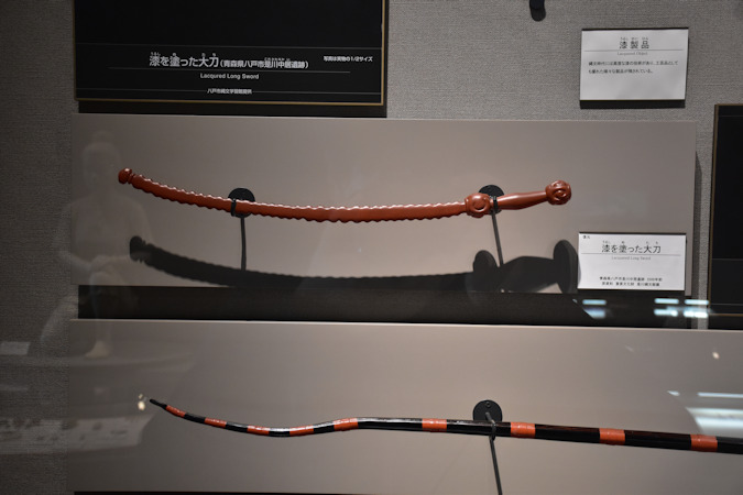 漆を塗った太刀の復元品。原資料は約2500年前のもので、縄文時代の高度な漆技術を示すものです。