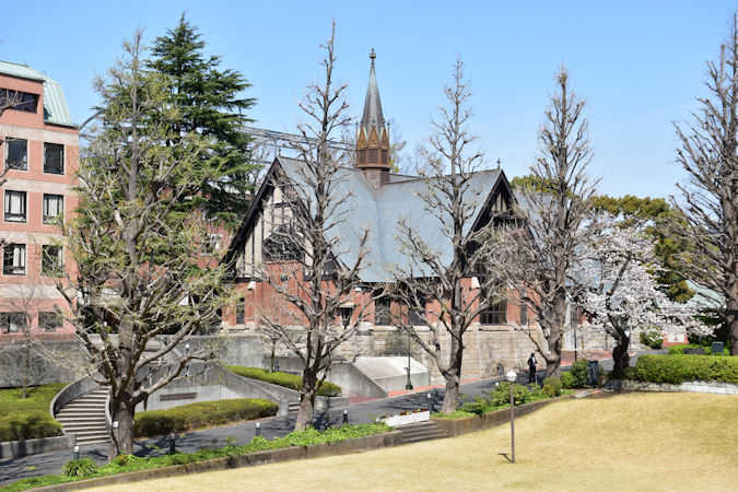 こちらは明治学院記念館。1890(明治23)年築で、設計はH.Mランディス(宣教師)と推定。ネオゴシック様式の建物で、1階に小チャペルがあります。1階は煉瓦造で、2階は1894(明治27)年の地震で大破したため木造に改築されています。こちらも港区指定有形文化財、東京都「特に景観上重要な歴史的建造物等」に指定されています。