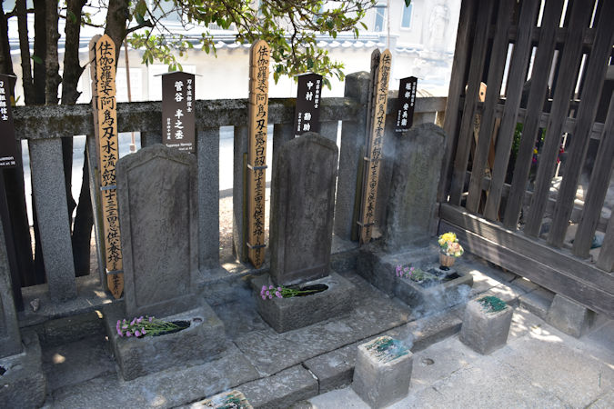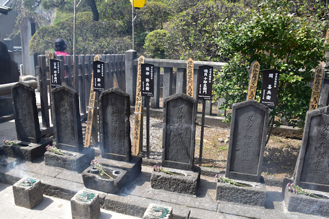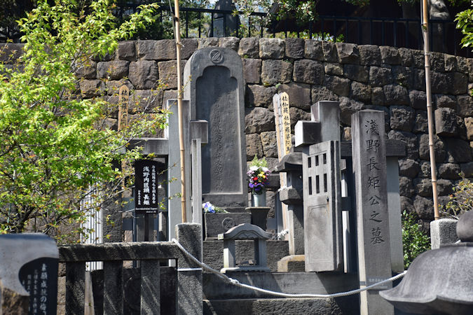 続いて泉岳寺へ。播州赤穂城主浅野家の菩提寺で、1701(元禄14)年に浅野長矩 (ながのり) が江戸城本丸大廊下(通称松の廊下)で吉良義央を刀で斬りつけ切腹させられ、ここに葬られたほか、翌年に吉良義央(上野介)を討った大石良雄ら赤穂浪士四十七士の墓があり、いわゆる「忠臣蔵」ゆかりの寺院として多くの人が訪れています。