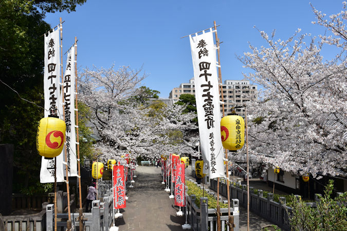 ちょうど、春の義士祭が開催されるタイミングだったので、にぎやかな雰囲気です。上写真の山門は、1832(天保3)年築。2階部分には十六羅漢が安置されています。