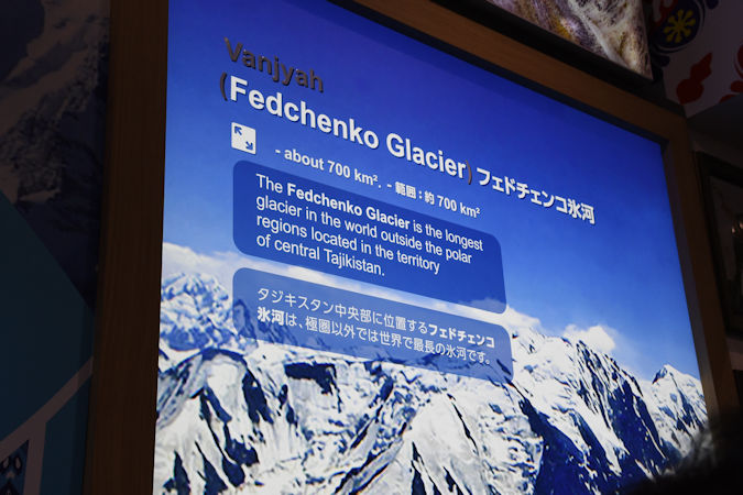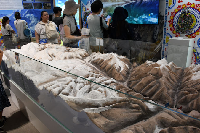 パミール高原にある「ヴァンジヤフ氷河」(フェドチェンコ氷河)のジオラマ。海抜6974mから流れ出し、面積は約700平方メートル、全長は約77q。極域以外では世界最大級の氷河です。1878年に知られるようになり、名前はロシアの探検家アレクセイ・フェドチェンコ(1844〜1873年)に因みます。