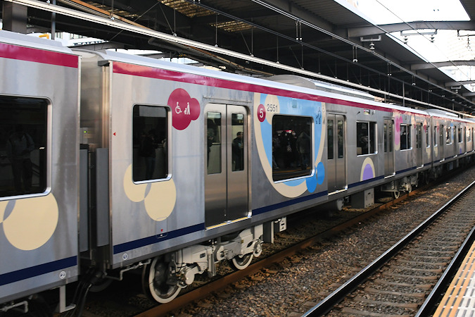 デビュー記念ステッカーを掲出した2000系。車両前面、側面ともに円をモチーフにしたラウンド型の形状。システム面ではフルSiC素子を用いた新型のVVVFインバータ制御装置(京王7000系と比較し約20%の省エネ性能向上)を搭載しているのが特徴。