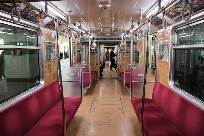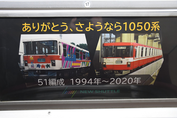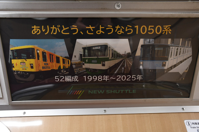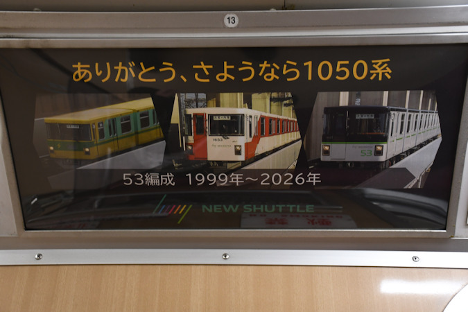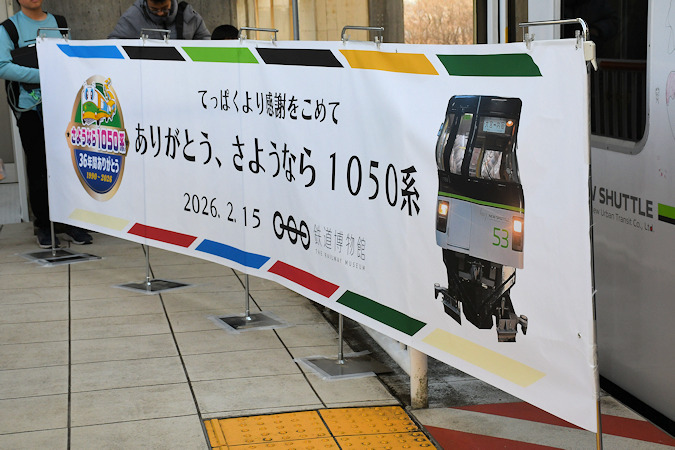 2026(令和8)年2月21日(土)、ラストランイベントを2月15日(日)に行ったニューシャトル1050系53編成が丸山駅2番線で展示され、車内の公開等が行われました。なお、車両の内外には保育園児やイベント参加者等による様々なお絵描きが行われました。