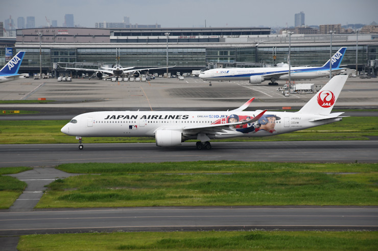 A350-900導入記念で、日本航空の標準塗装に「Airbus A350」の銀色のロゴが描かれたエアバスA350-900 (A350-941/レジ:JA02XJ)。