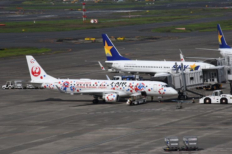 2025(令和7)年開催の大阪・関西万博をPRする特別塗装機「ミャクミャクJET 1号機」となったE190(レジ:JA252J)。