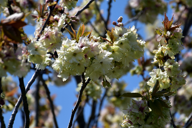 ギョイコウ(御衣黄)はバラ科サクラ属の植物で、オオシマザクラを母として生まれたサトザクラの一種。4月中下旬に見頃を迎えます。桜と言えばピンク色と思いがちですが、開花時は淡い緑色からスタート(上写真)し、徐々に黄色に変化し、花びらの中心部が赤く染まっていくのが特徴です。