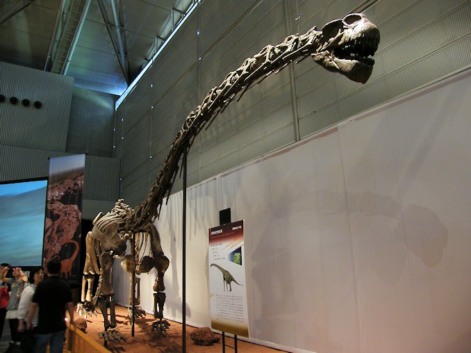 他の中国産の恐竜と同様、長い首が特徴である竜脚類。首の骨の付け根から3個の一部が癒合しており、首の可動範囲が狭くなっていました。また、胴の骨が多く、竜脚類としては原始的であると考えられています。(解説:馬藤永徳)