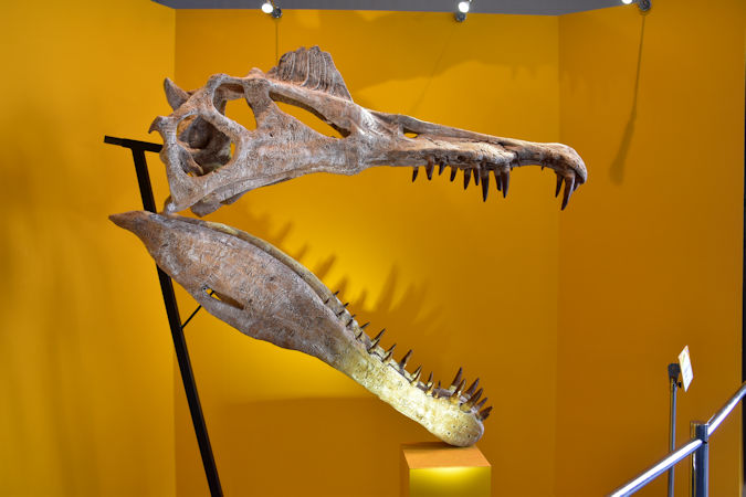 白亜紀後期の竜盤目 獣脚亜目 スピノサウルス科の恐竜。最新の学説に基づき、水生していた様子を再現したロボットです。