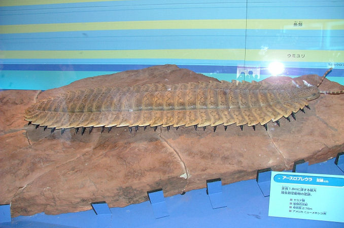 メガニューラ (北九州市立 いのちのたび博物館にて) 羽を広げると70cmもの大きさになるメガニューラ。これまで知られた中で、最大の昆虫です。 ![]() ゴキブリの一種 (北九州市立 いのちのたび博物館にて) 現在と姿形を余り変えていないゴキブリ。石炭紀に登場しました。 ![]() アースロプレウラ (世界の巨大恐竜博2006にて) 全長1.8mに達する陸上節足動物。 |