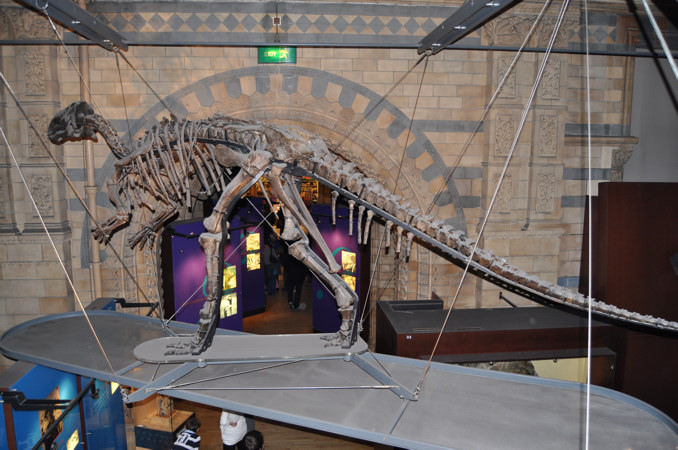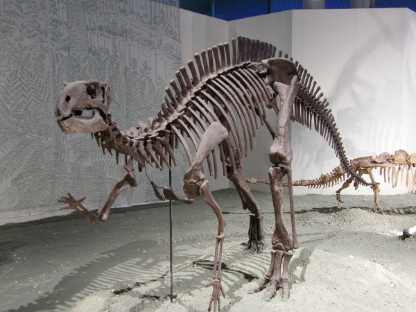 イグアノドン (白亜紀前期/ロンドン自然史博物館にて) 草食性の恐竜で、体の重心が後足の上にあるため、普段は四足歩行ですが、二足で立つこともできました。 また、親指に特徴的な爪を持っており、まるで角のような形をしています。これは武器として使われたことでしょう。