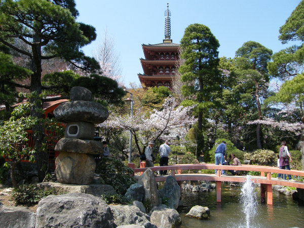 新選組の土方歳三出身地に近いことから、彼の銅像があることでも有名な東京都日野市の高幡不動尊。室町時代に建造された仁王門など、都内有数の古建築が魅力です。シンボル的存在の五重塔は、戦後になってから再建されたものですが、とても品があり、桜との組み合わせは抜群です。