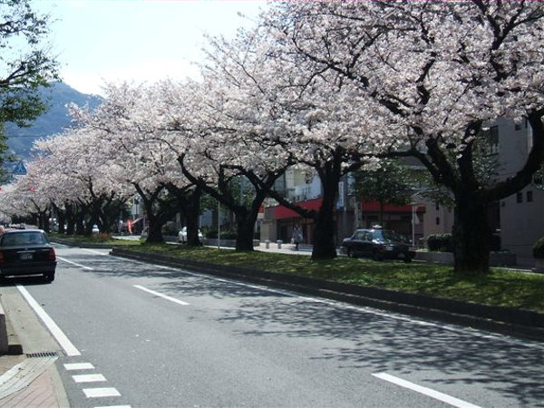 北九州市八幡東区の祇園1丁目〜2丁目付近にある「さくら通り」と呼ばれる大通りとその周辺。ここはバス通りでもあるのですが、中央分離帯に桜が植えられているので、満開の時はバスの中からも桜を楽しめます。