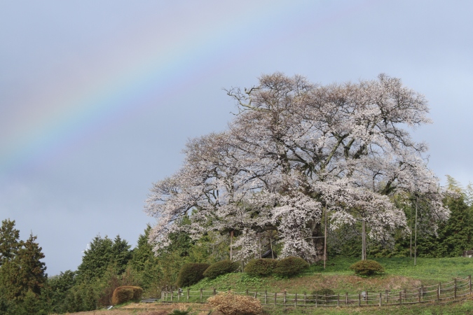彼岸桜ではあるものの標高の高いところに位置するため開花時期は4月中旬〜下旬。老木でありながら満開時には見事な花を咲かせ、多くの観光客で賑わいます。