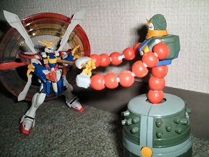 各国それぞれ所有しているのですが、これがもう、固定観念の塊のようなもので、相手国の人が見たらどう思うか、ヒヤヒヤものです(笑)。ネオメキシコ代表はテキーラガンダム、ネオトルコ代表はミナレットガンダム、ネオデンマーク代表はマーメイドガンダム、ネオオランダ代表は全身が風車の形をしたネーデルガンダム、ネオエジプト代表はファラオガンダムW世、ネオインド代表は、コブラの形をしたコブラガンダム、極めつけはネオネパール代表のマンダラガンダム(写真)。