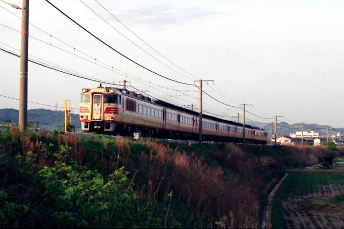 長女との旅から帰って間もない2002年4月27日(土)、高校1年と大学入試の帰路の2回に亘って追いかけた「キハ181系やくも」のリバイバル運転があるとの新聞情報を得、懐かしさで居ても立ってもおられなくなったわたくしは、夕方に岡山駅を発つ下り列車に照準を合わせて撮影を決行しました。また、翌月には元姫路在住の人間としては、地元を走る昼行特急列車として思い出深い「しおじ」が489系電車によりリバイバル運転されました。ちょっと家の用事のバタバタの結果、撮影場所の選択をミスってしまいましたけど撮れただけでもマシと云うべきか・・・。まあ、そうしたミスも今となっては良き思い出です。