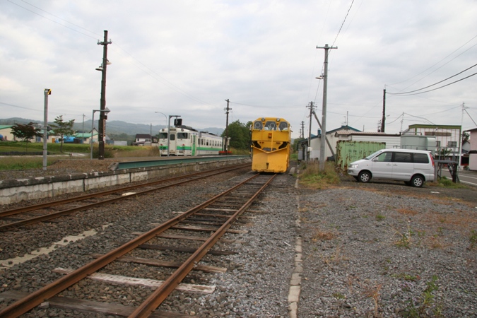 貨物列車交換用に長く伸びた構内で入れ違う単行気動車