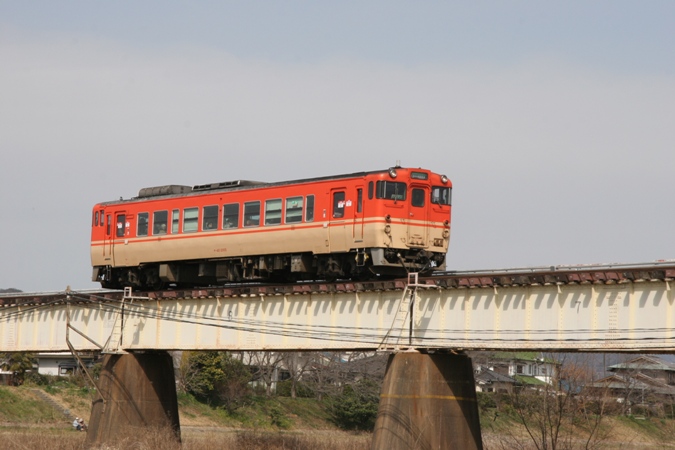 冬晴れの中、単行気動車がのんびりと橋を渡ります