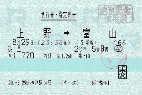 西神中央 5時54分 → 6時27分 新神戸 6時45分(64A のぞみ64号) → 9時33分 東京 〜(中略)〜 上野 23時33分(611M 能登) → (車中泊)