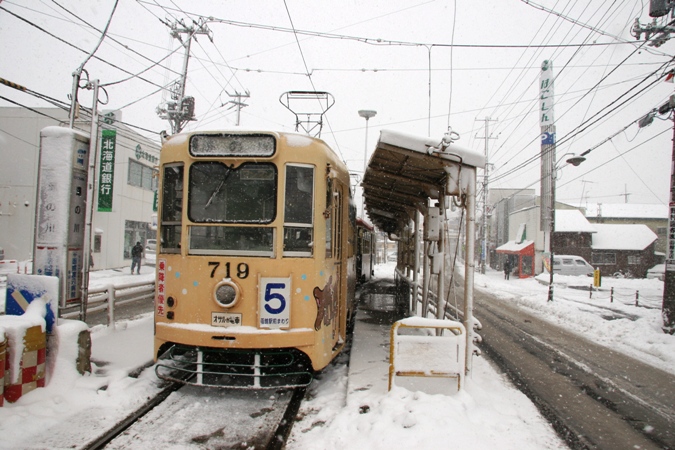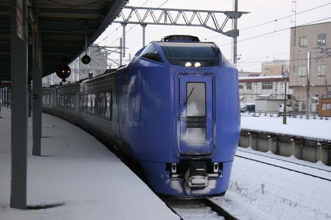 そうは云うものの、いつしか眠りに落ち、途中、羽越線内のY字分岐で意識を回復したりしながら朝を迎えました。が、しかし何か列車速度がゆっくりに感じます。窓の外は一面の雪景色。なんと爆弾低気圧が日本海を進んだせいで何と大雪にっ!列車は約50分遅れでの運行となってました。この影響は大きく、予定の485系「白鳥41号」の乗車が叶わないばかりか、全区間乗車予定の函館市電も未乗区間のみの乗車に短縮せざるを得なくなりました(涙)