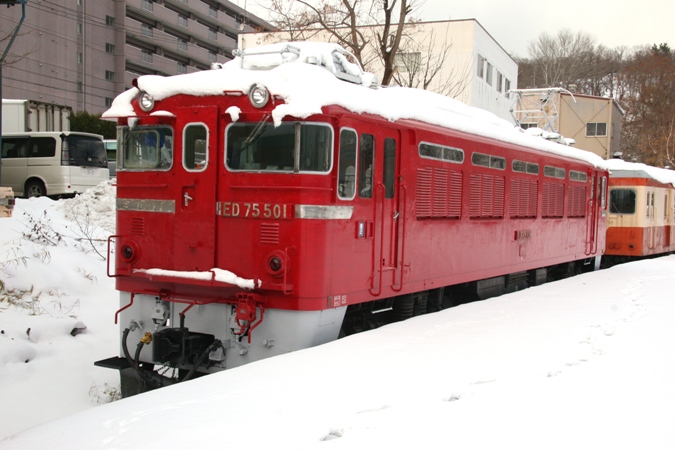 豊平川での「北斗星」、札幌駅での「サロベツ」と押さえておきたい列車を着実に押さえる事が出来たので満足した段階で、ホームでラーメンをすすりながら何をしたもんか考えてました。そこでふと思い出したのが「手宮駅」に鉄道博物館があったこと。平成2年6月に亡妻と新婚旅行で訪れた場所です。どうせ時間も余裕があるし、なかなか機会に恵まれるもんやないんで思い立ったら吉日とばかりに目の前のホームの小樽行き電車に飛び乗りました。小樽築港駅からの光景は随分と変わって再開発が進んでましたが小樽駅は昔のまんま。機嫌良く雪が解けてビチャビチャの道をスタスタと歩き出しました。とまでは良かったんですが、向こうの方からヘルメットを被った自転車乗りの外国人二人連れが接近してきます。そう、モ●モ●教徒です(怒)『絶対に声掛けてくるわ!(怒)』と思っていると案の定、『ちょっとイイですかぁ〜〜〜?』独特の舐めまわすような語尾で寄って来たので、イラッと来たんで『急いどんねんっ!』と睨みつけて撃退しておきました(笑)