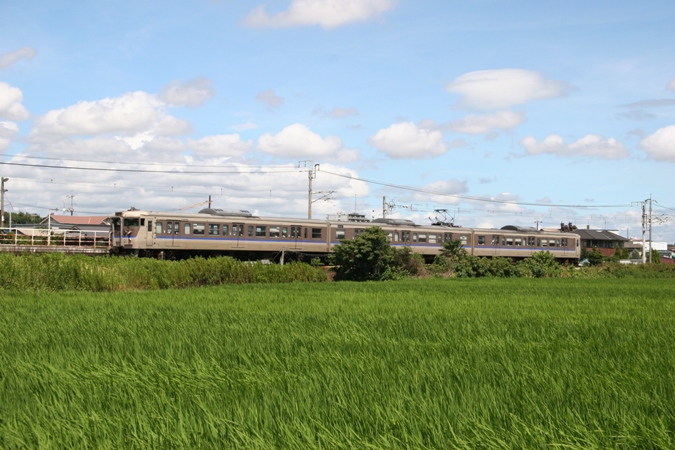 空の雲と稲の緑、そして車両・・・美しい光景ですね