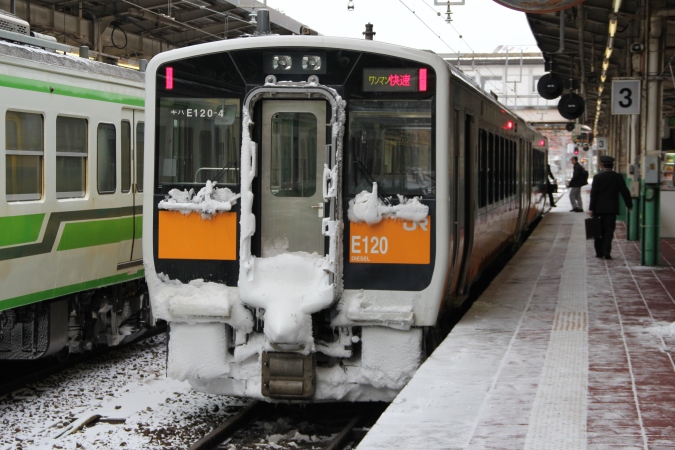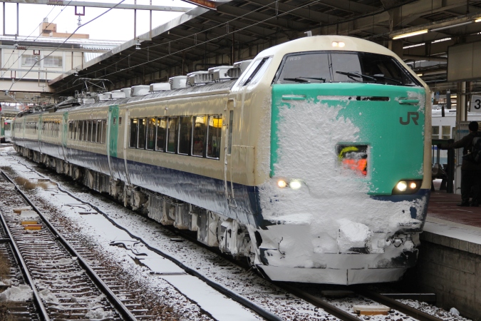 バスの運転手さんのルート変更と速度規制に起因する大幅な遅れを詫びる放送で目覚めましたが、新潟まで無事に運んで頂いただけで大感謝やのに、運行会社の帰責事由ではない、ましてや会社の差配の結果ではない事由やのにお詫びされんでもと感じた次第(謝)まあ無事に新潟駅。雪を被った車両に『ほぉ〜』