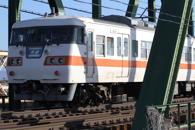 次のターゲットは「117系快速」。混雑する大垣市内を『間に合うんやろか?』とハラハラしながら車を進め、何とか揖斐川の東詰にて安全に駐車出来て撮影向きのポイントを見つけました。下り側は半逆光ではありますが・・・