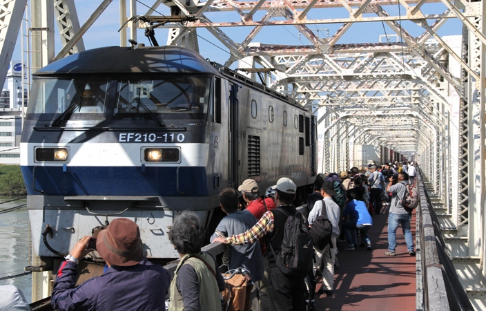 吹田操車場から分岐した城東貨物線が新幹線や阪急電鉄と交差した後に渡る「淀川橋梁」。一般には「赤川鉄橋」という通称が馴染み深い橋梁です。元々複線用の橋梁に単線しか敷設しなかったため、大阪市が旧国鉄から残り部分を借り受けて自転車・歩行者用の橋梁として「赤川仮橋」と名付けて供用していました。人が歩く真横を巨大な貨物列車が通過する珍しい光景が日常見られることで名を馳せましたが、長年に及ぶ沿線住民の声に応えたのかは別として、同線を旅客線転用し「おおさか東線」として整備することが決定され、遂にこの年の10月末をもって慣れ親しんだ光景に別れの時が訪れたのでした。
