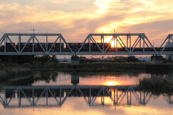 測点を空と橋との境界にずらしてシルエットに 日没迫る時間帯に上り貨物が通過することは貨物時刻表で確認してたんで、これは中州から撮るべしと決めてました。同じ考えの方が他に2人程いらっしゃり、最終的には仲良くほぼ同じ位置取りで撮影したんでした。