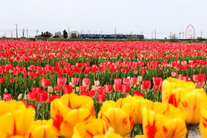 この後、途中で富山地方鉄道の古い駅なんかに立ち寄りながら、漸くチューリップ畑を発見!そこは早月川の左岸側でミラージュランドを遠くに見るポイントでした。