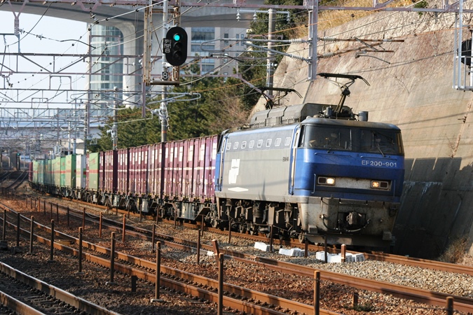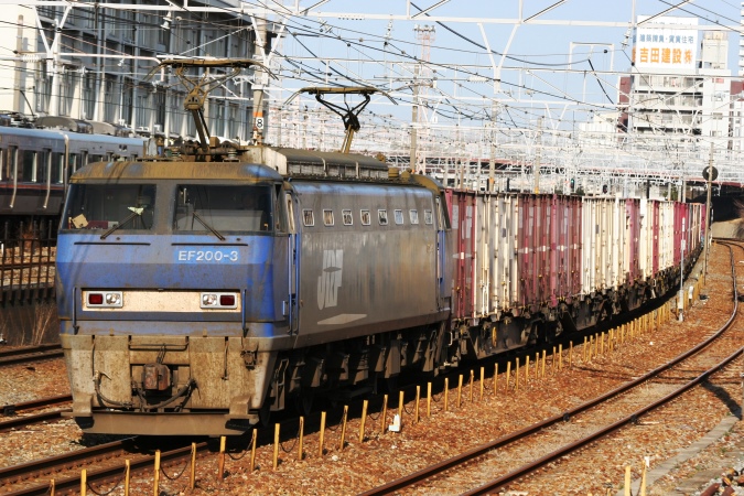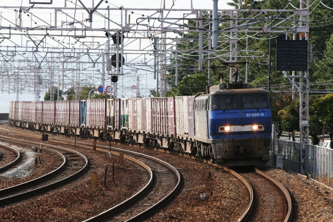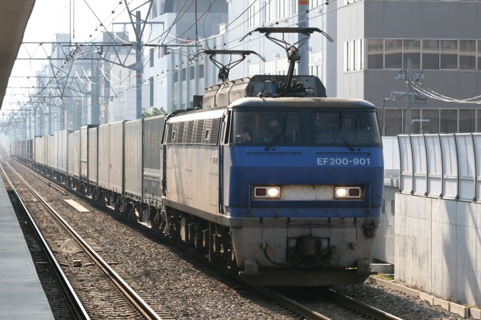 平成生まれのEF200。東海道・山陽本線での輸送力を抜本的に増強する目的で歴代最強の6,000kWの出力を誇る機関車として、将来を嘱望されて開発・量産に着手しましたが、その高出力が徒となって電圧降下を引き起こすなどの事情から、その高出力を活かすこと能わず、出力を抑えた運用とすることで妥協点を見出すこととなったのでした。