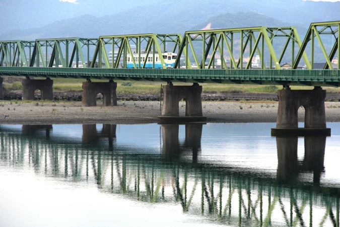 昨晩は、お風呂からは随分南下し、道の駅「公方の郷なかがわ」さんでビバーグ。この時も洒落ならん位に暑かったわ・・・。朝一番の列車が那賀川を渡ってきます