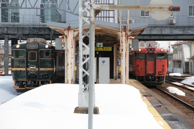 (左)キハ40-2027 金トヤ 8562D べるもんた2号 (右)キハ47-1134 金トヤ 341D/城端線高岡駅